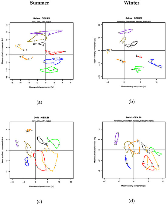 Diurnal hodographs of the mean vectors are useful in deducing the physical meteorology driving each XOEN ellipse, indicating consistency for a given ellipse and whether two or more ellipses share a single mechanism. These hodographs have proved useful in the study of the sea/land breeze cycle—from the theory proposed by Haurwitz [18], which predicts that they form open loops that progress clockwise in time in the northern hemisphere and anticlockwise in the southern, to its application at various locations [19,20,21,22,23,24]. This confirms Haurwitz theory at coastal locations where the weak Coriolis effects are not overwhelmed by other factors, such as coastal orography that can reverse the direction [25] or present as a figure-of-eight loop. On the other hand, directionally constrained mechanisms such as katabatic winds present as closed linear loops.