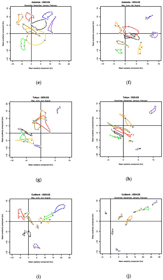 Tokyo represents a location with strong sea/land breeze components within a monsoon-dominated climate. The change between winter and summer monsoon is sudden, and the respective characteristics are almost exclusive, as seen in Figure S43. Lying on a west-facing coast, the sea breeze builds to a maximum easterly just after noon. These sea breeze components are strong in summer, seen in the open anticlockwise loops in Figure 13g, against the expectation of [25], and weaker in (h) in winter. The superposition of two pairs of ellipses, 1–6 and 2–3, suggests each pair may be a single mechanism.