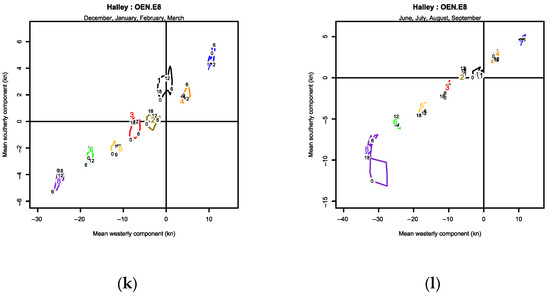 Diurnal hodographs of the mean vectors for summer (left) and winter (right) periods for each of 8 OEN ellipses, ranked in descending relative frequency: (a,b) Salina; (c,d) Delhi; (e,f) Adelaide; (g,h) Tokyo; (i,j) Cut Bank; (k,l) Halley. Ellipse colors: 1—black, 2—brown, 3—red, 4—orange, 5—yellow, 6—green, 7—blue and 8—violet. The small 0, 6, 12 and 18 values indicate the hour of day. Note that the zonal (westerly) and meridional (southerly) scales vary between periods and locations, to make maximum use of the available plotting space.