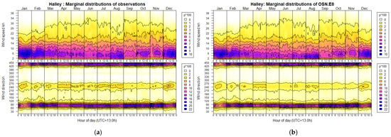 Direction distributions, , in Figure 23 show a reasonable fit of the OSN model to the observations, except when passing through In most cases, the observations appear discontinuous through , suggesting there may be issues with the way that the ten-minute mean of the observed wind direction is measured over the break in value. The observed FM12/FM15 wind direction is the ten-minute mean of the argument of the wind vector, , as measured by a vane, but this causes issues when averaged over the break in value between and . This is not concommitant with the argument of the ten-minute mean vector,, provided by the XOEN model since, due to the non-linear relationship, . On the other hand, the model evaluation is continuous through 0°, obviating any need to employ empirical polar distributions such as von Mises [32,33].