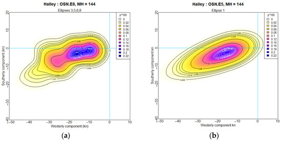 The automated unsupervised analysis process has been reported “warts-and-all” to prove the efficacy of the methodology by using observations from stations that provide an onerous test. The outlier in for ellipse 1 for MH = 216 at Halley, Figure 17a, as noted in Section 4.2.1, is one of the few occasional “warts” that were revealed. This cause is examined in Figure 21 where it is seen that one of the isolated contours has sufficient influence to define a new ellipse 8, reducing the number of ellipses defining the body of the distribution. The former ellipses 1 and 2 merge and ellipse 1 takes the former position of 8, which is why the secondary mode of ellipse 1 and the mode of ellipse 8 are aligned in Figure 19a. This anomaly was corrected by re-initialization using the correctly threaded neighbor MH = 217 and refitting. It is remarkable that this is the only obvious “wart” to emerge in 4032 fits and speaks to the robustness of the OEN/OSN fitting and threading process. Strategies for unsupervised detection and the correction of outlier fits are being developed and will be incorporated in any future update of the R scripts. For now, charts of for the individual ellipses are convenient indicators of suspected outliers.