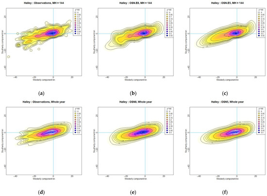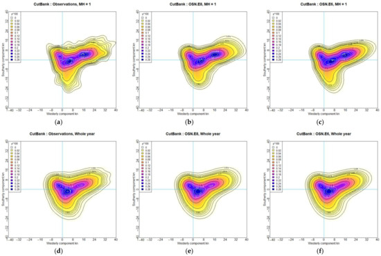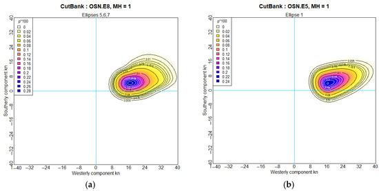 A compilation of the observed jPDF, , at each MH, excluding true calms, was produced by two-dimensional kernel density estimation (2dKDE), replacing the previous binning of speed and direction and polar to Cartesian transformation, which required various intermediate levels of smoothing [4]. The advantages of 2dKDE are that smoothing is uniform across the whole field and controlled by the kernel bandwidth, and that the previous hole at the origin of , caused by the exclusion of all calms [4], is automatically filled appropriately. The kernel bandwidth should be large enough to reduce observation variance, but not so large as to over-smooth a significant variation of value. A bandwidth three times the speed increment, i.e., 3 kn, ensures all elements are filled reasonably smoothly in the matrix. A typical observed jPDF is shown in Figure 4a, , for MH = 1 at 00:00 in January at Cut Bank. A slight ripple at 10° directional intervals is evident in the outer contours due to light smoothing by the kernel bandwidth.
