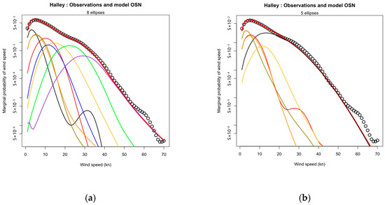 The annual marginal distribution of wind speed and direction, and , are principal metrics in studies where seasonal/diurnal variation is of no interest. These may be evaluated from the XOEN models and are included in the Supplementary Figures for each of the eight locations of this study. Here, they are presented together in Figure 22 and Figure 23 to facilitate comparison between the study stations. These charts compare the observed and with those evaluated from OSN and show the contributions of each ellipse to the model.