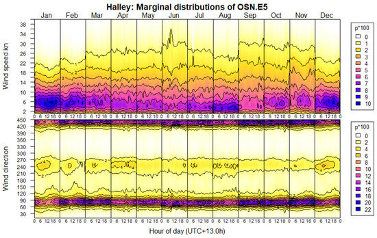 - Cook, N.J. Visualising Seasonal-Diurnal Trends in Wind Observations. Weather 2015, 70, 117–121. [Google Scholar] [CrossRef]