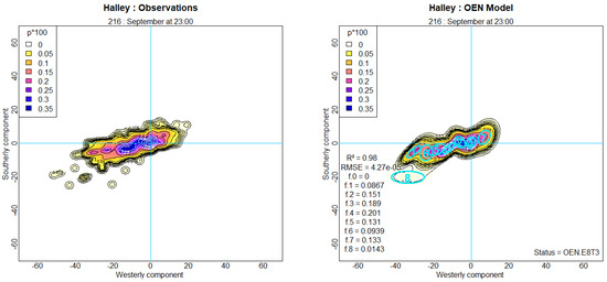 OEN jPDFs for MH = 216 (12:00 in May) at Halley Station: Left—observations; Right—threaded eight-ellipse fit. The scale, p*100, indicates in kn−2.