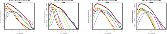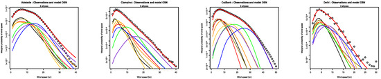 Marginal distribution of wind speed, , for the study stations evaluated from OSN (thick red curve) compared with observations (circles). Contributions by each ellipse are shown by the thin curves: 1—black, 2—brown, 3—red, 4—orange, 5 -yellow, 6—green, 7—blue, 8—violet.