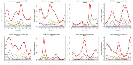 Marginal distribution of wind Direction, , for the study stations evaluated from OSN (thick red curve) compared with observations (circles). Contributions by each ellipse are shown by the thin curves: 1—black, 2—brown, 3—red, 4—orange, 5 -yellow, 6—green, 7—blue, 8—violet.