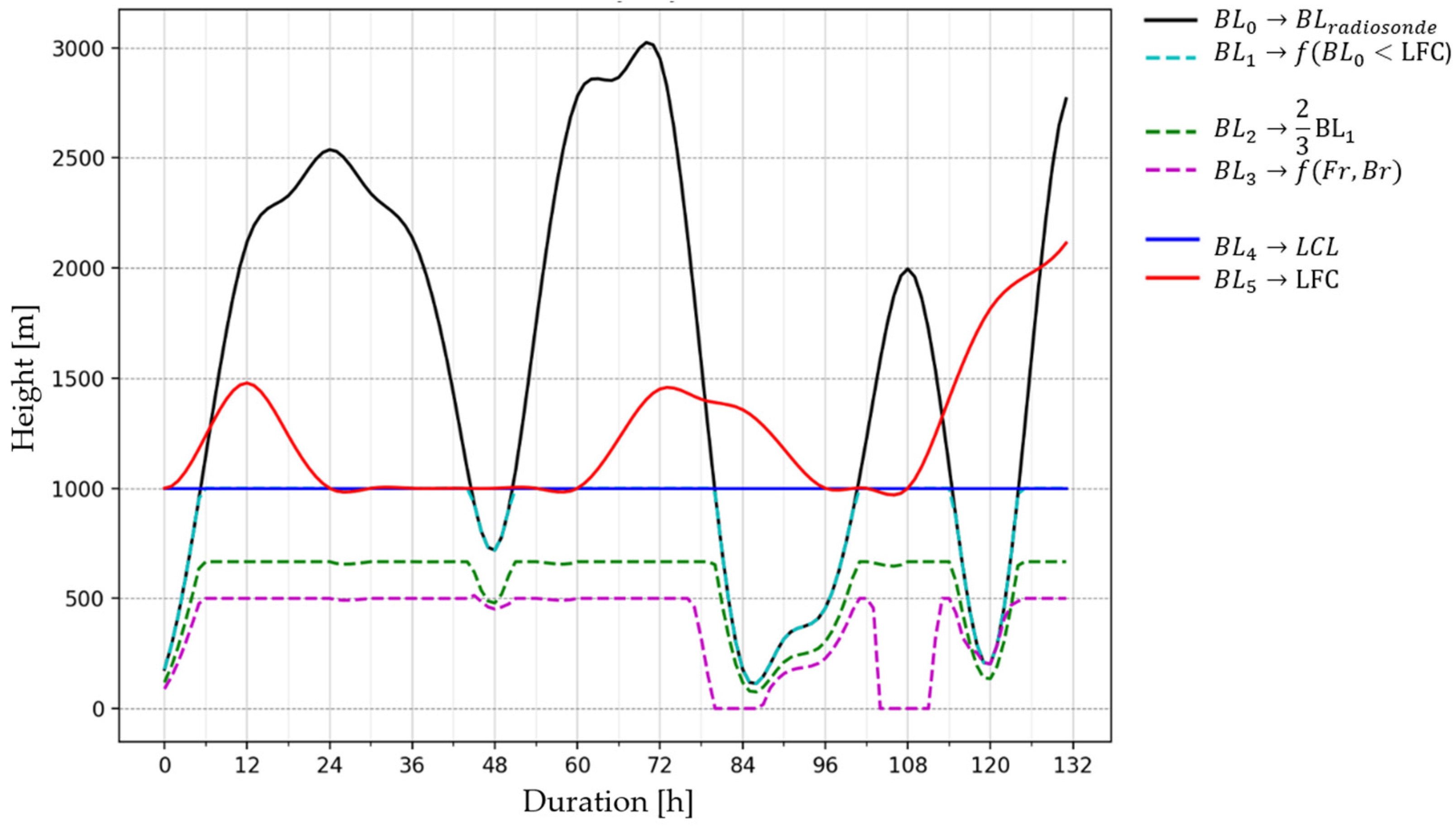 - The Equation (A19) shows how BL0 is superiorly bounded by the LFC. In fact, especially when moist convection is triggered, the BL is located quite near to LFC or LCL; therefore, they have been considered as representative layers.