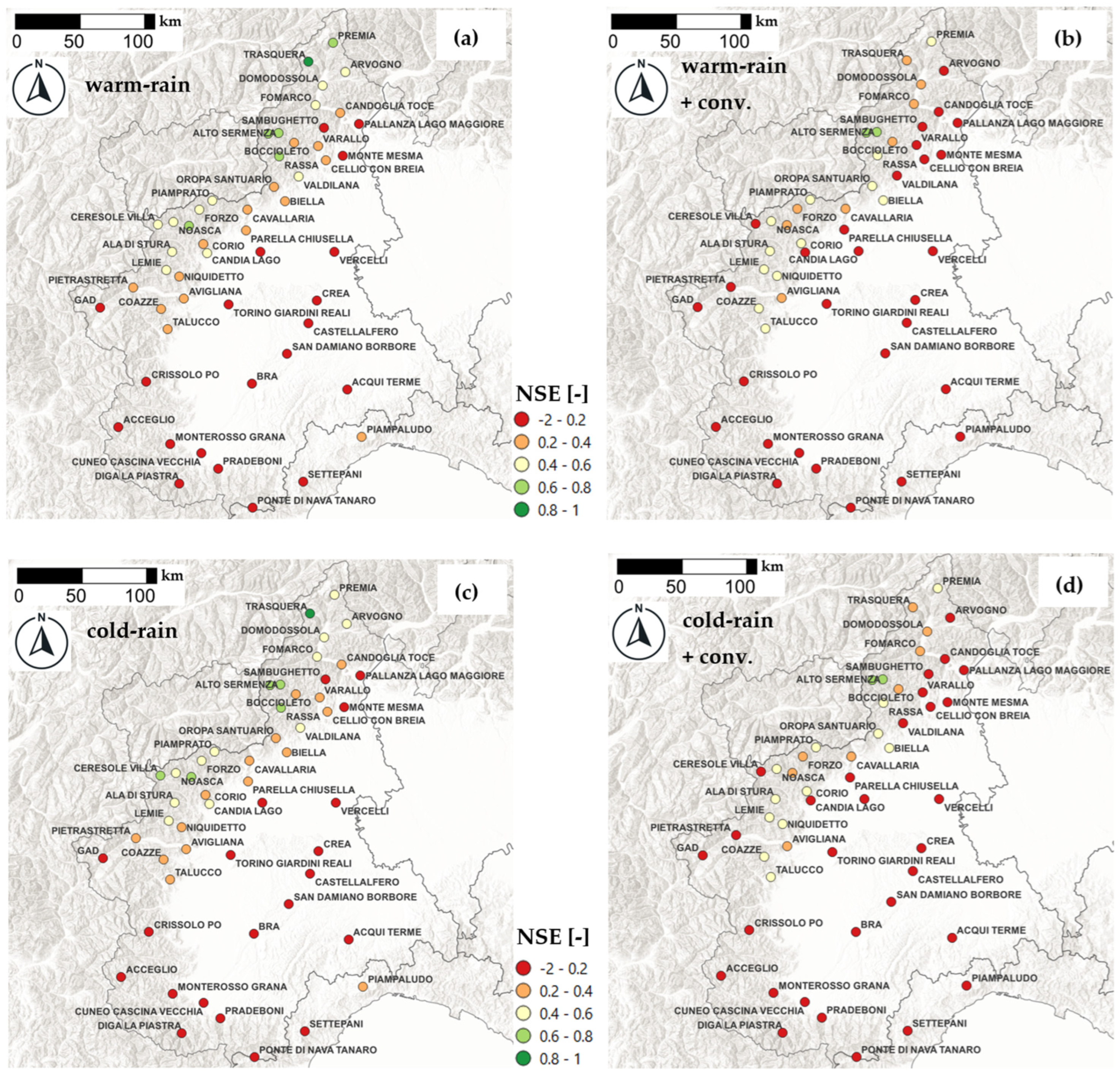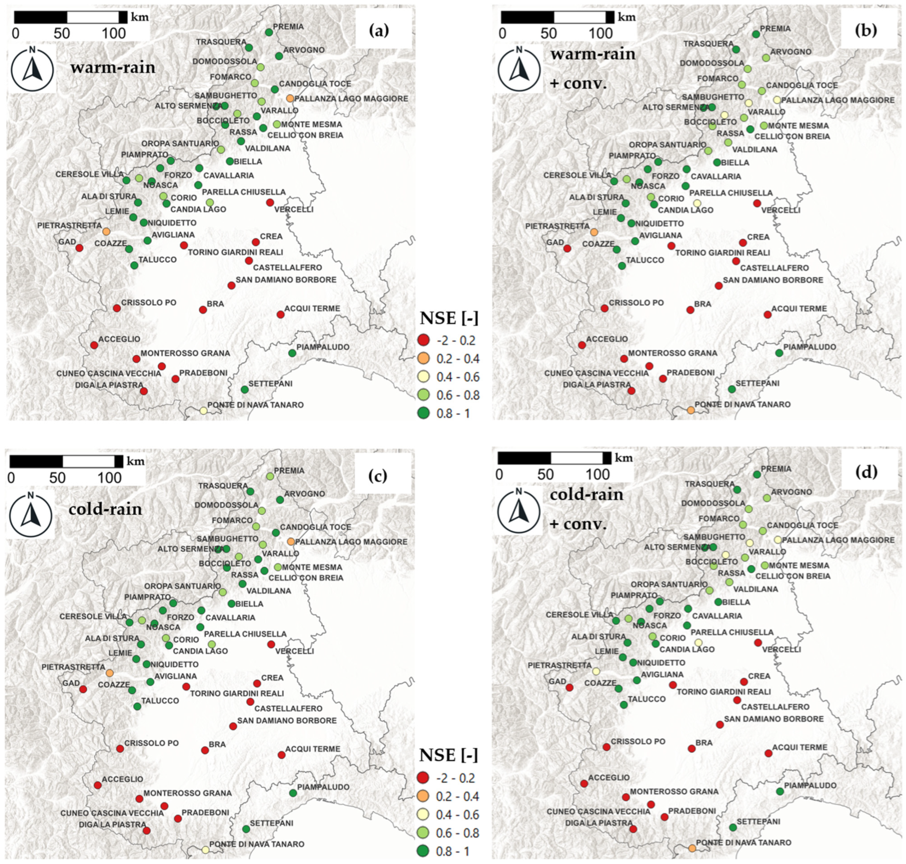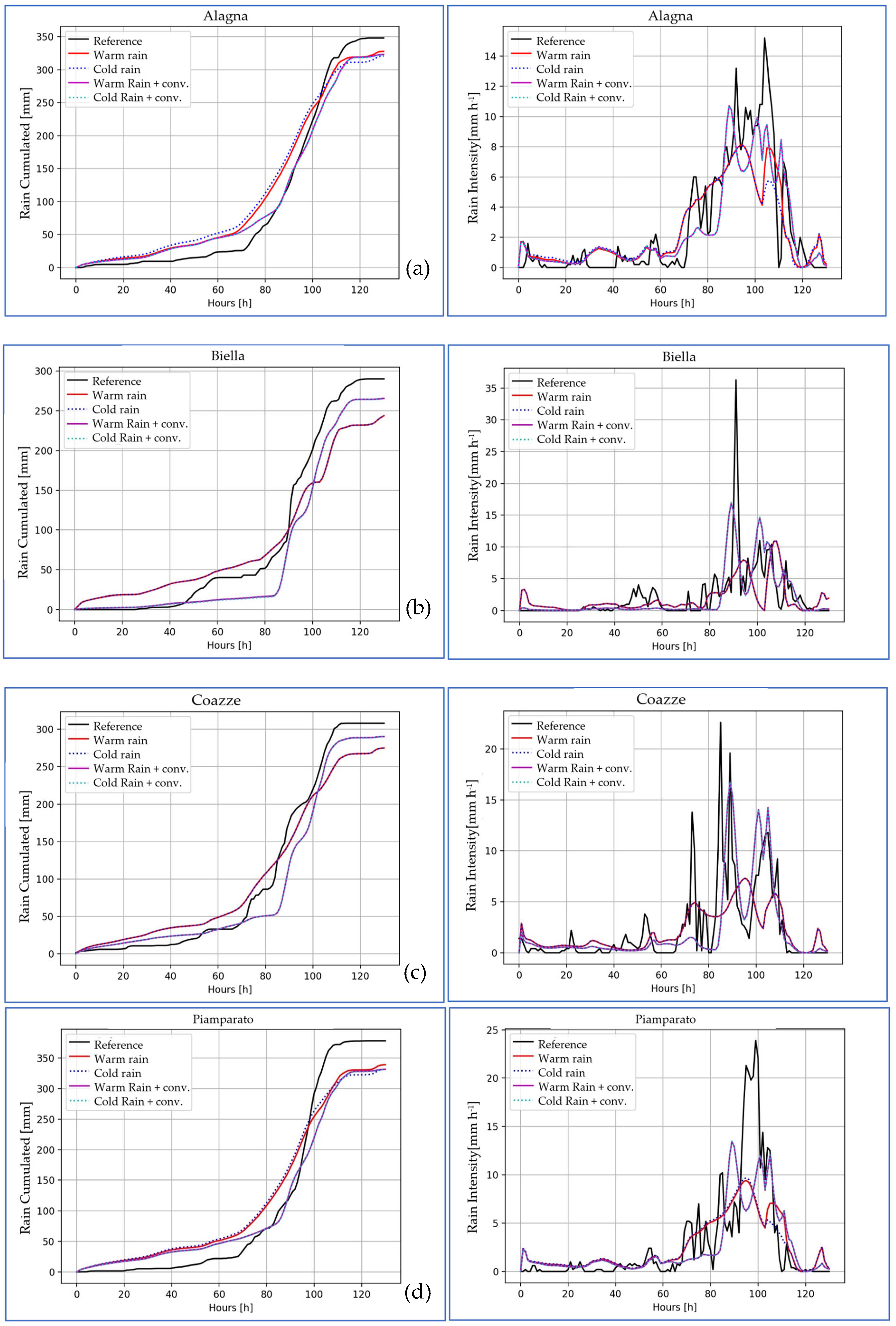 - The intensity pattern is rather interesting since the simulated rainfall is able to follow the reference data, giving a correct depiction of the rain rate pattern and highlighting the most intense phase of the event (between 15th and 17th of April). Again, “no-convection” models produce lower rain rates with respect to the “enabled-convection” routines. This is physically consistent, since convective rainfalls are reported to be most intense with respect to the stratiform ones. On the contrary, the high spikes recorded by reference rain-gauges are not always reproduced due to the numerical smoothing introduced by model time integration.