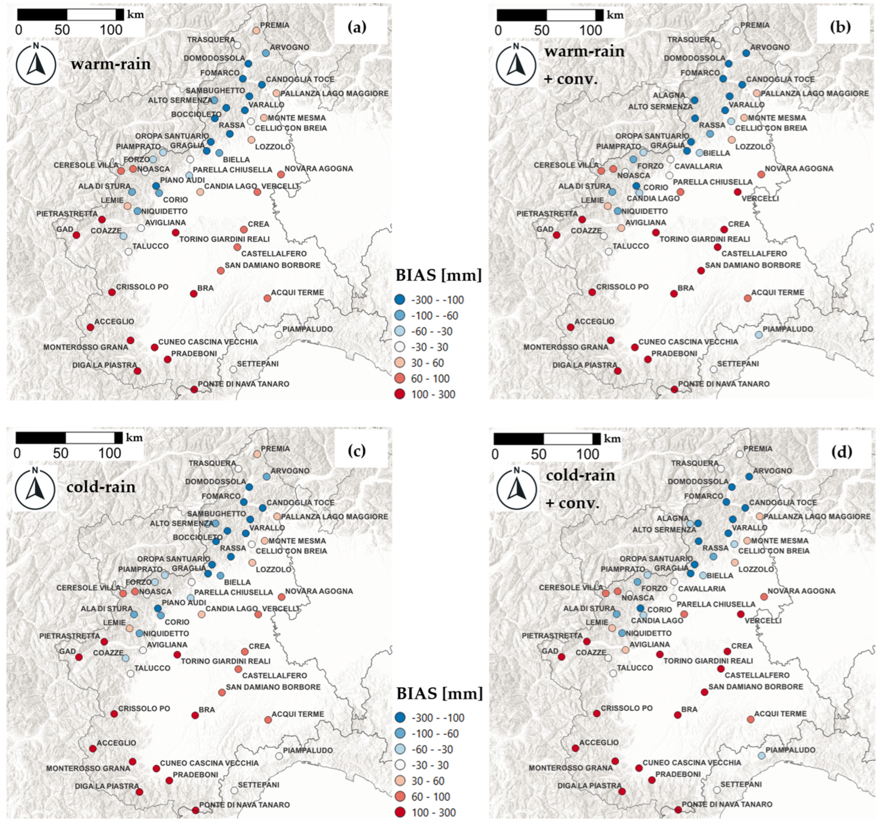 - Cumulated precipitation evolution generally follows the reference data, with “no-convection” routines slightly anticipating the “enabled-convection” versions. Moreover, the total amounts recorded at the end of the simulated event are comparable (with BIAS lower than 50 mm), confirming the results of the error analysis previously conducted.
