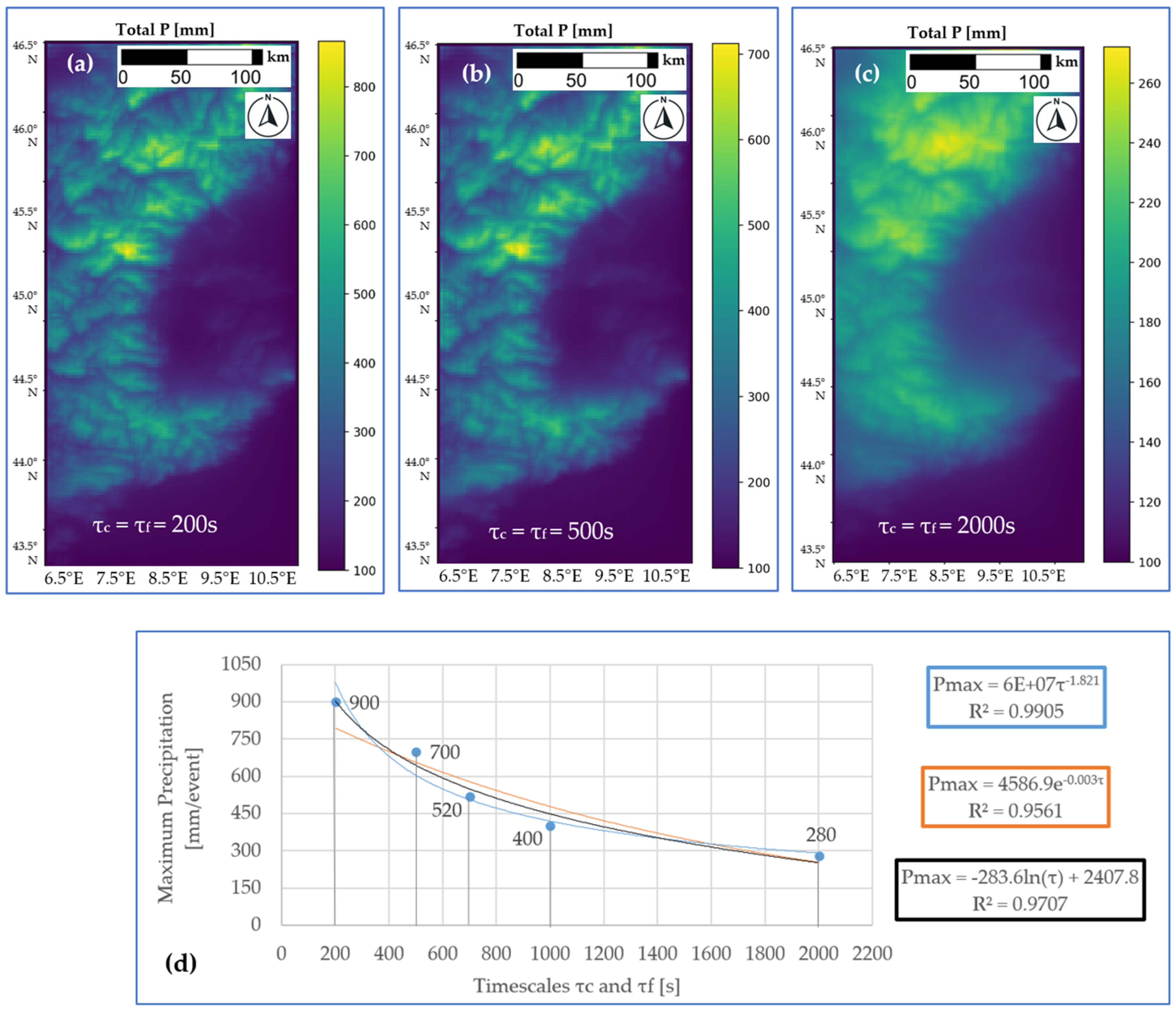 - For τf4, the “rain height” considered as representative of the droplet’s fallout start was selected equal to (A13), considering the sum of the reference DEM height. Hdem and the water vapour scale Hw. This expression was already proposed by [27] and slightly adapted to consider the local topography.