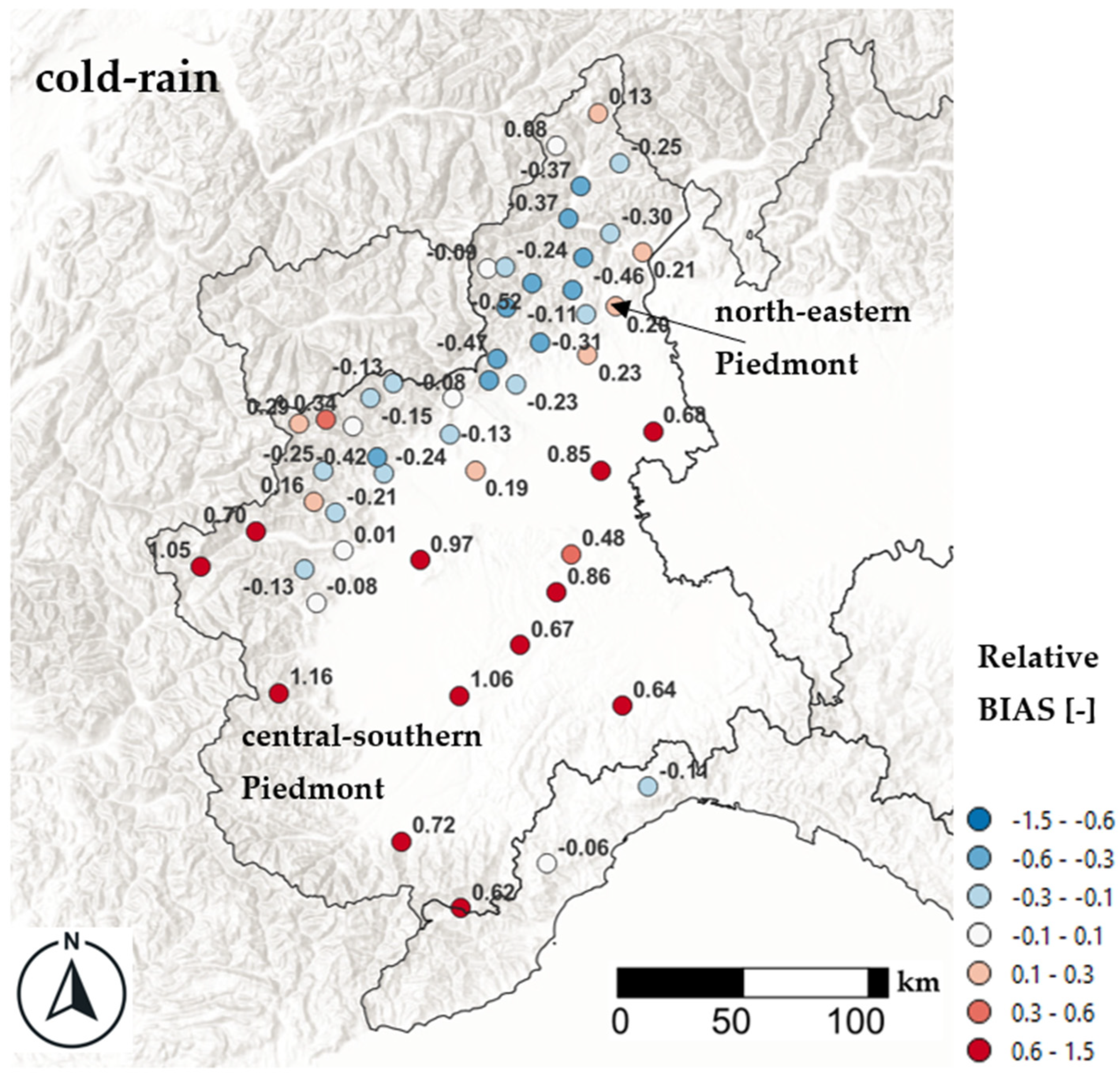 | Rain-Gauge Stations—ARPA Piemonte | Total Rainfall [mm] | Total Rainfall LUME 2D [mm] | BIAS [mm] | Relative BIAS [-] |
