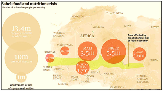 Drought remains one of the most severe threats to human well-being and ecological stability across Africa, especially in West Africa. It is a form of extreme climatic variability [1], long hypothesized to be deeply rooted in the region’s climate system [2,3]. Its creeping and cumulative nature makes both the onset and termination difficult to determine [4], often becoming noticeable only after substantial impacts emerge [4,5]. In the Niger Basin, drought is the most complex and least understood natural hazard, historically triggering famine, displacement, and substantial economic losses. Major crises in the 1970s, 1980s, and 2010–2013, when the 2012 episode left 18.7 million people food insecure, demonstrate the depth of this challenge [2,4,6,7,8,9,10]. The high number and spatial extent of the affected people shown in Figure 1 are clear evidence of the failure of existing approaches to drought monitoring and early warning systems in the Niger Basin, which are driven majorly by univariate drought indicators. As [11] reported, the 2010 Sahel drought reduced agricultural output by more than 40% and displaced communities across northern Nigeria, Niger, and Mali, underscoring weaknesses in existing early-warning systems.