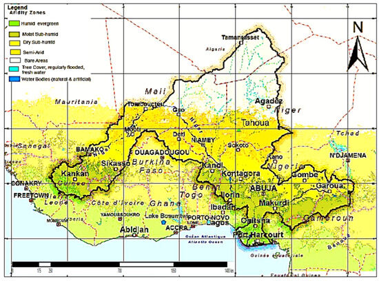 Furthermore, the tropical climate of Niger Basin witnesses 7 months of cropping season (i.e., April to October) every year, during which more than 95% of the total annual rainfall is experienced [87]. Usually, rainfall in West Africa is produced through Meso-Scale Convective System (MCS) and West African Monsoon (WAM) from the Atlantic Ocean, giving normal annual rainfall ranging from about 100 mm in the Sahel zone to more than 2500 mm along the pure tropical areas in the Guinea zone [2]. The basin regularly experiences alternating wet and dry seasons that characterize the climate of the region and comprises two sub-areas, the semi-arid Sahelian region (12° N–20° N) and humid Guinean coast (south of 10° N). The Sahel region represents an ecotone or transition between the Saharan desert and the wet climate of Guinea coast.