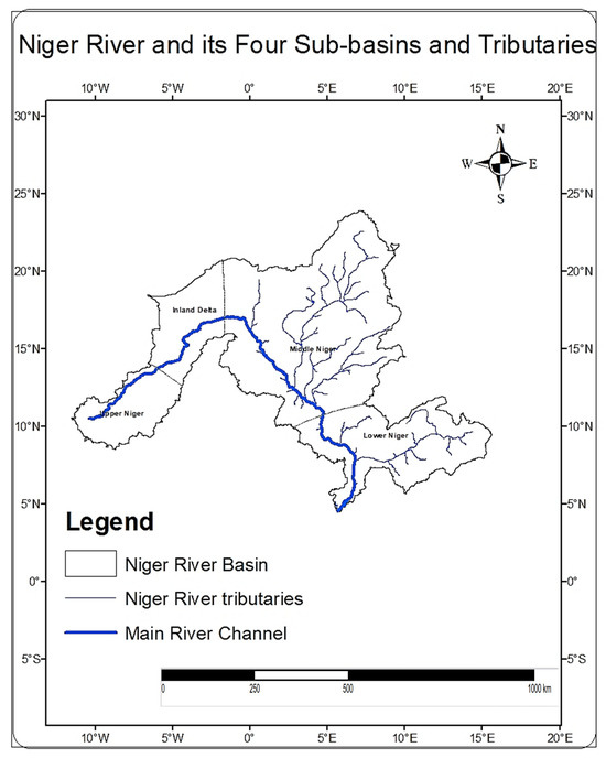 Additionally, because of its heterogeneous nature and large size, as well as its topographical and hydrological characteristics, the basin is often divided into four sub-basins, namely, the Upper Niger, inner delta, Middle Niger, and Lower Niger [88]. Figure 3 is a schematic map of the four (4) Niger River sub-basins. These sub-basins provide a better understanding of the biophysical, hydrological, and socio-economic processes affecting the basin’s water resources [89,90].