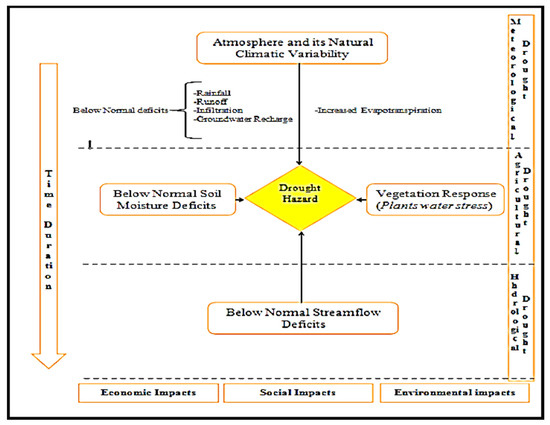 Meteorological drought arises from prolonged precipitation shortages. These shortages, worsened by rising temperature or evapotranspiration, trigger agricultural drought when soil moisture falls below levels needed for crop growth, leading to reduced yields. Hydrological drought occurs when surface and subsurface water resources runoff and groundwater recharge fall below normal. Socio-economic drought emerges when these water deficits disrupt human activities.