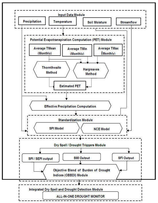 The general methodological framework for the development of the NBDM is described in Figure 7. There are six (6) different modules, namely, the (i) input data/database management module, (ii) the potential evapotranspiration (PET) computation module, (iii) the indicators standardization module, (iv) dry spell/drought triggers module, (v) Objective Blend of Burden of Drought Indices (OBBDI) module, and (vi) integrated dry spell and drought detection module. Provided below is a brief description of each module.