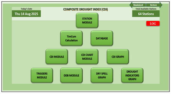- The dry spell and drought conditions triggers module: It comprises the various drought definitions or drought initiation (onset) thresholds for each of the respective indices considered in this study, namely, SPI, SEPI, SMI, SFI, and CDI. It also consists of the threshold(s) for the phase change or transition from dry spell to actual drought phase.