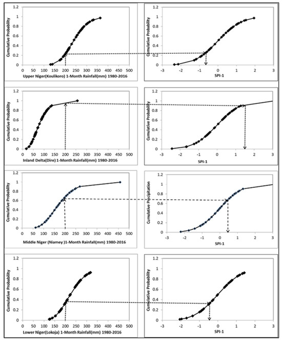 To determine operational objective drought thresholds for defining and measuring drought episodes in the Niger Basin, a “Baseline Assessment Analysis (BAA)” of the region’s precipitation behavior when known historical drought-induced famine with serious impact on the society occurred was carried out by determining the percentiles of the precipitation anomalies. To achieve this, the precipitation behavior during the well-known 1980s drought-induced famine was examined. All the precipitation records were first rendered as percentiles with respect to the selected study period 1980–2016 using the “Percentile Rank (PR)” method. Normally, the PR method returns the rank of value in a data set as a percentage of the data set. Thus, within a dataset, this function can be used to evaluate the relative standing of a value in a time series 7 (https://support.microsoft.com/en-us/office/percentrank-function-f1b5836c-9619-4847-9fc9-080ec9024442, accessed on 8 December 2022). The analyses were carried out using Excel for Microsoft 365.