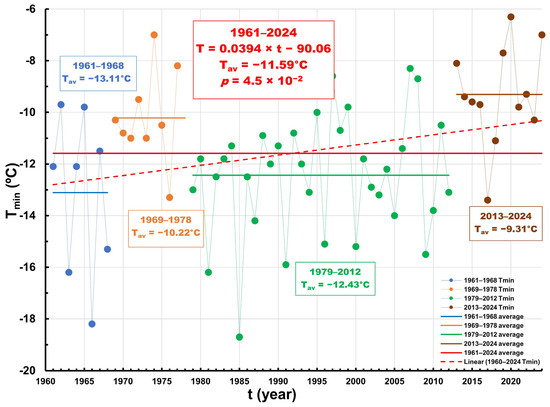 The series of annual minimum (Figure 2), mean (Figure 3), and maximum (Figure 4) air temperatures observed over 64 years (1961–2024) reveal strong warming trends in recent decades. The most pronounced increase is in mean annual temperatures, particularly during 1998–2024, when the average trend amounted to 0.44 °C per decade.