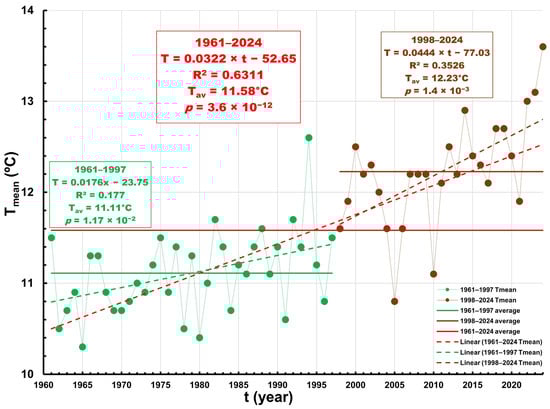 Application of the RAPS method revealed subsequences with statistically significant differences between the average values of adjacent segments. Four subsequences were detected for minimum annual temperatures: (1) 1961–1968; (2) 1969–1978; (3) 1979–2012; (4) 2013–2024. Two subsequences were identified for mean annual temperatures: (1) 1961–1997; (2) 1998–2024, and likewise for maximum annual temperatures: (1) 1961–1999; (2) 2000–2024. Table 1 reports the average values of characteristic temperatures for each subsequence, together with the corresponding p-values of statistical significance derived from the F-test and t-test.