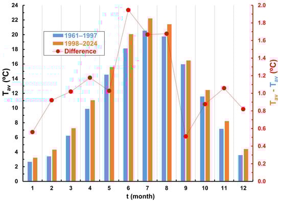Figure 5 shows histograms of the average mean monthly air temperatures in Pazin measured for two sub-periods: (1) 1961–1997; (2) 1998–2024. Their differences for individual months are plotted as points connected by lines. The largest differences, ranging from 1.66 °C to 1.95 °C, appear in the hottest part of the year, from June to August, while the smallest difference of 0.51 °C occurs in September.