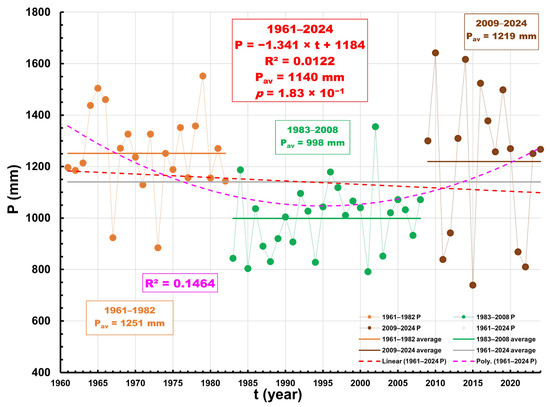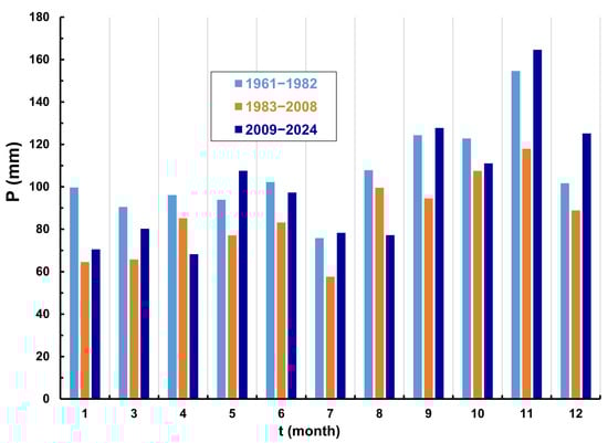 Using the RAPS method, three sub-periods with statistically significant differences in mean values were identified: (1) 1961–1982; (2) 1983–2008; (3) 2009–2024. Table 1 lists the average precipitation for each of these sub-periods and the p-values for the statistical significance of the differences, as determined by the F-test and t-test.