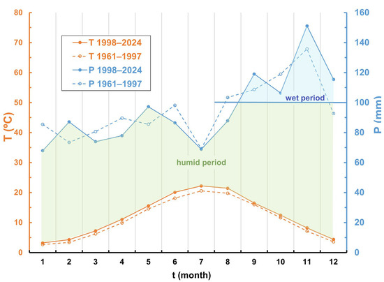 A comparative graphical representation of average air temperature and average precipitation during a given period, for each month of the year at a particular location, is known as the Gaussen–Walter diagram [33,34,35]. This diagram illustrates the average behavior of temperature and precipitation, as key climatic characteristics of the analyzed site, highlighting variations in their relationship throughout the twelve months of the year. The climatic diagram clearly indicates the distribution of humid and arid periods over the year. These diagrams visually represent the monthly average temperature and precipitation, with the scale set to that 20 mm of precipitation corresponds to 10 °C. When the precipitation curve falls below the temperature curve, the intervening area denotes aridity; when the precipitation curve lies above the temperature curve, conditions are humid; and when precipitation exceeds 100 mm, conditions are classified as wet.