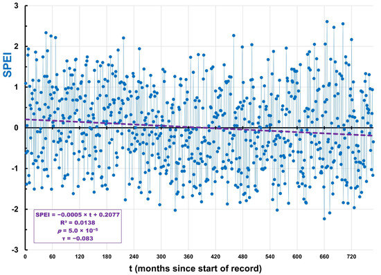 Figure 10 presents the series of monthly SPEI values for Pazin (January 1961–December 2024), comprising 768 data points. The regression line shows a statistically significant downward trend (p = 5.0 ×10−5), indicating that the occurrence of dry months has become more frequent in recent decades.