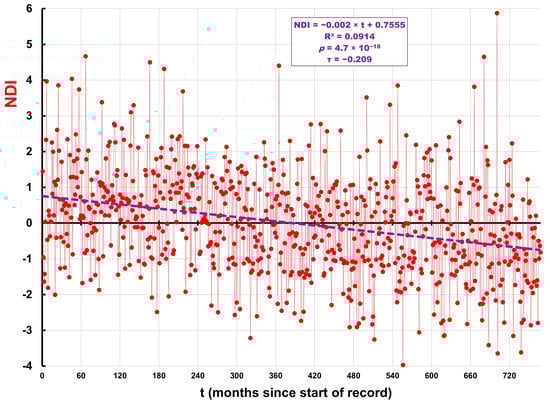 Figure 11 shows the series of monthly NDI series for Pazin for the same period (January 1961–December 2024), also totaling 768 data points. Here, the regression line likewise displays a statistically significant downward trend (p = 4.7 × 10−18), again suggesting that drought months are increasingly frequent. Notably, the NDI values indicate a stronger intensification of drought processes compared to SPEI.