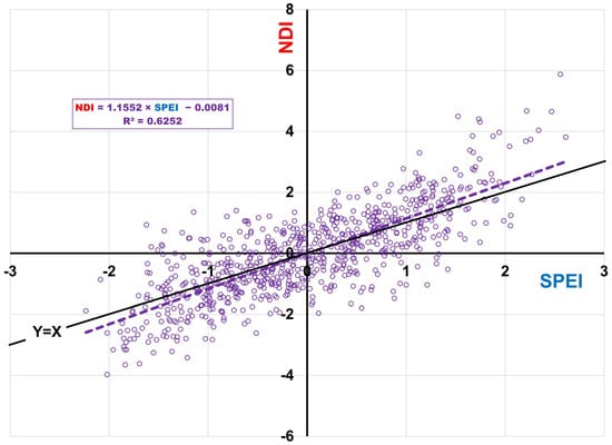 The graphical relationship between NDI (Y-axis) and SPEI (X-axis), shown in Figure 12, demonstrates that both indices describe dryness and/or wetness characteristics in a largely consistent manner. The coefficient of determination is high (R2 = 0.6252). Furthermore, the regression line nearly coincides with the bisector of the first and third quadrants, i.e., the line Y = X.
