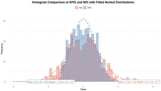 Histogram comparison of SPEI (blue) and NDI (red) with fitted normal distribution curves.