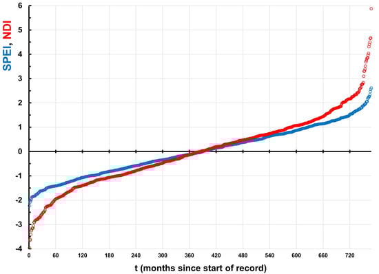 Duration curves of SPEI (blue) and NDI (red) for Pazin, January 1961–December 2024.