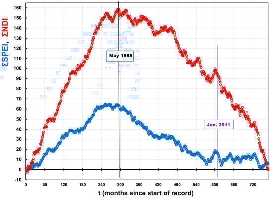 A cumulative analysis of the monthly SPEI and NDI values provides further insight into alternating wet and dry sub-periods. The cumulative of SPEI (blue) and NDI (red) are graphically presented in Figure 15. Both cumulative series display broadly similar patterns. The interval from January 1961 to May 1985 was predominantly wet, punctuated by short dry spells. From June 1985 through December 2024, dry periods increasingly dominate. A striking divergence emerges between the two cumulative series from January 2011 onward: while the NDI cumulative curve continues to decline sharply, the cumulative SPEI curve shows no decline, only oscillations.