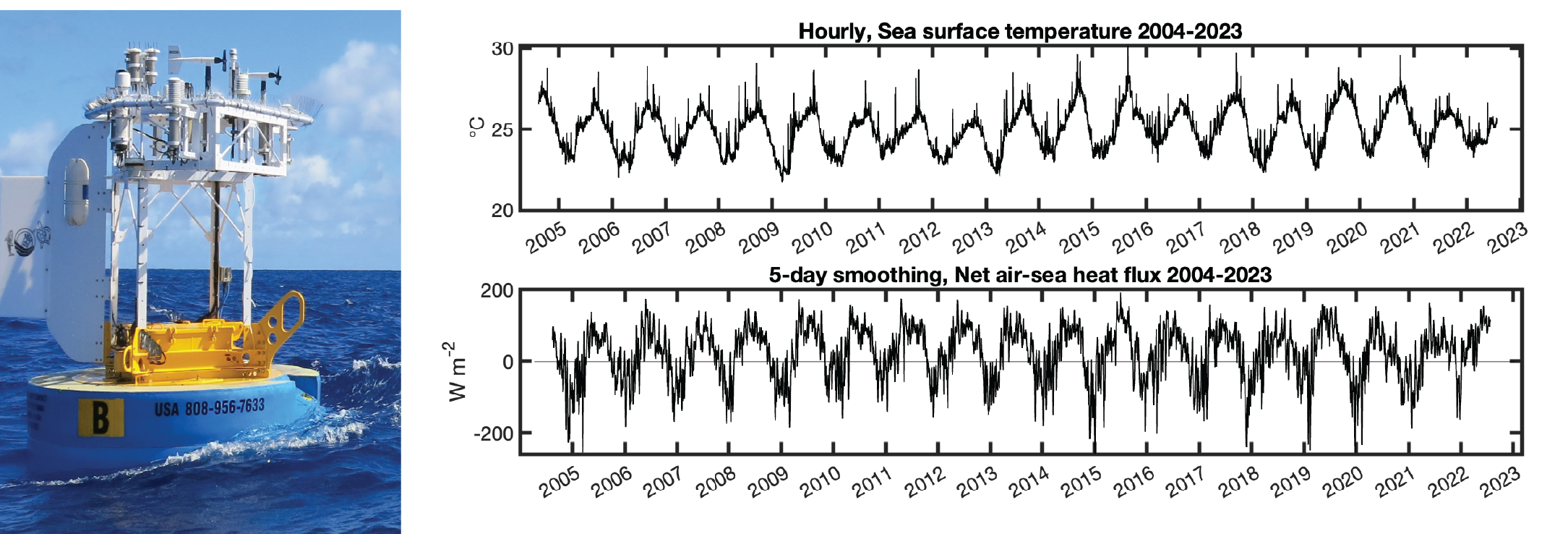| Sea surface temperature and salinity (SST, SSS) | Sea-Bird 37 MicroCAT | −0.75 to −0.85 m | Mounted on buoy bridle |