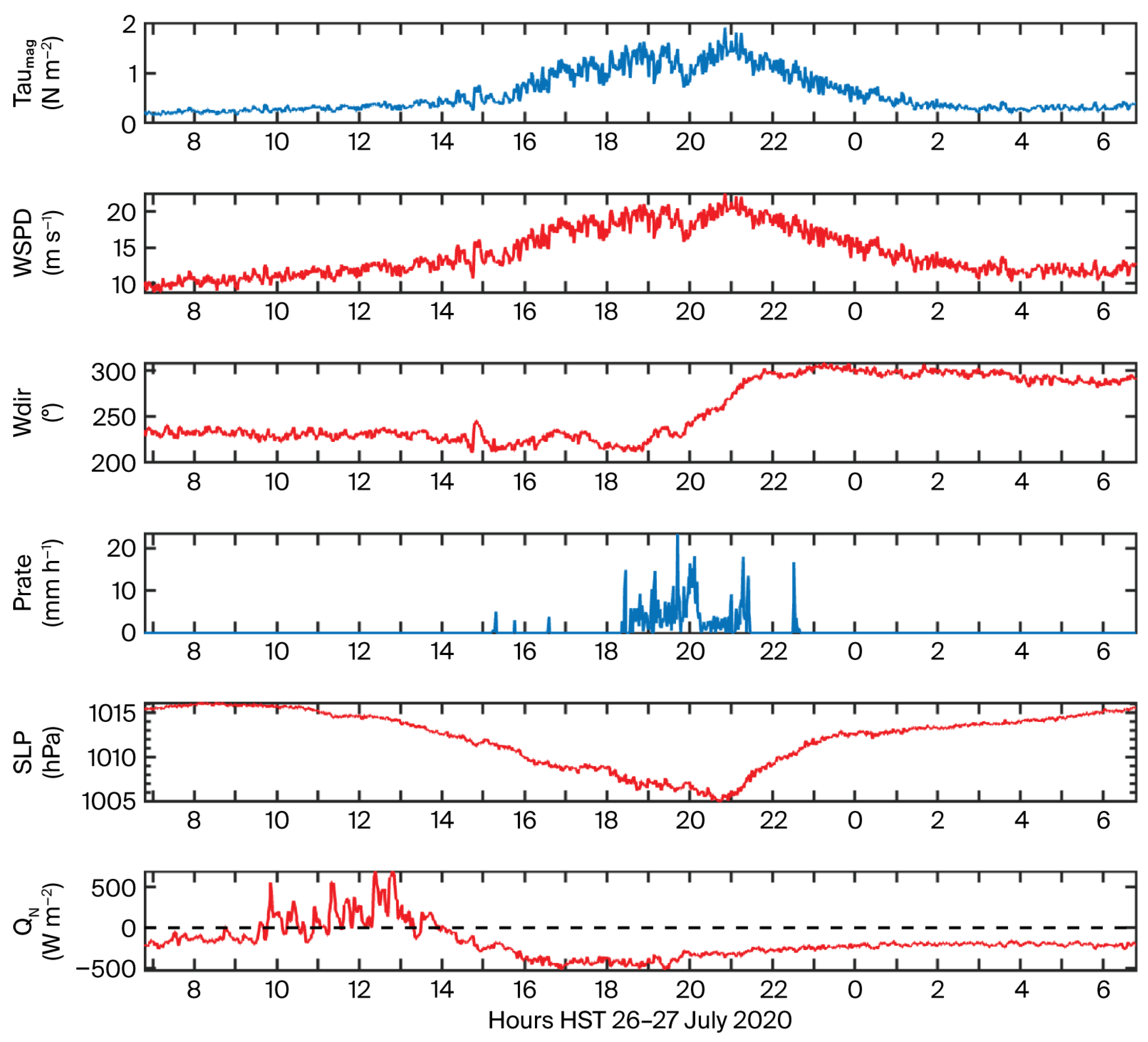 4.3. Strong Transient Signals in One-Minute Surface Meteorology and Air–Sea Fluxes
