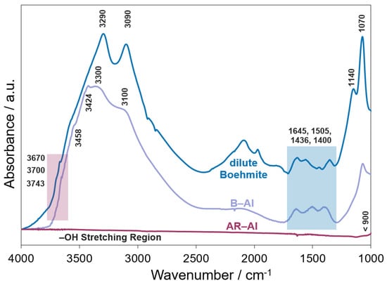 Comparison of dilute boehmite (blue), boehmite-surface (B-Al, purple), and as-received (AR-Al, magenta) DRIFTS spectra. Major absorbance peaks in the -OH region (3800–3000 cm−1) were observed for boehmite and B-Al, which are attributed to surface (>3500 cm−1) and bulk –OH stretching modes (<3500 cm−1); there were no detectable absorbance peaks in this region for AR-Al. Absorbance peaks were observed in the 1700–1400 cm−1 for carbonates and <1200 cm−1 for Al-OH and Al-O.