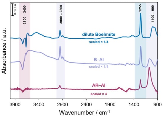 Results from CTMS dosing experiments for dilute Boehmite, B-Al, and AR-Al, showing positive growth in the Al-O-Si (1100–900 cm−1), methyl group deformation (1255 cm−1), and –CH stretch (3000–2800 cm−1) and negative peaks in the surface hydroxyl region (3800–3400 cm−1) for boehmite and B-Al.