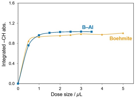 Saturation curves for boehmite (gold) and B-Al (blue) CTMS dosing experiments with dosing increments of 0.5 μL, indicating saturation points for all three surfaces based on dose size and stable –CH or integrated peak areas. The B-Al and boehmite samples remained relatively stable past 2 μL.