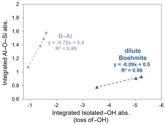 Figure 6 shows the linear correlations extracted from the integrated areas produced from the boehmite and B-Al saturation experiments, which have R2 values of 0.99. The negative slopes of the best fit lines agree with the loss of –OH groups with the growth of the Al-O-Si feature. These experiments indicated a semi-quantitative relationship between the reaction of surface hydroxyls and the formation of alkyl components for boehmite and B-Al. This relationship can be drawn from the integrated area of the Al-O-Si and surface retention of –CH3 on the AR-Al sample, which is shown in Figure 7. The R2 value for this regression was 0.94.