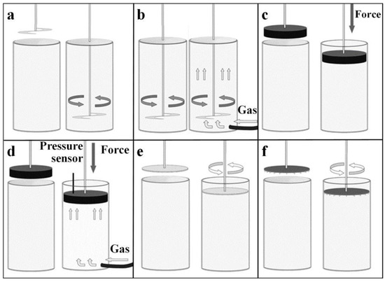 Measurement methodology for (a) stability, (b) aeration, (c) compressibility, (d) permeability, (e) shear, (f) and wall friction.