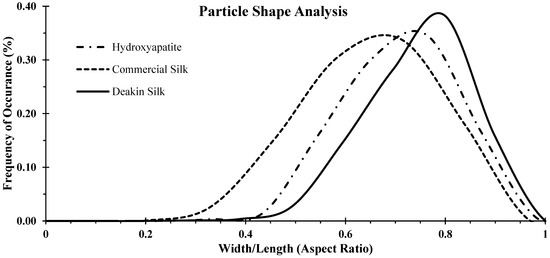 The distributions of aspect ratios for the samples measured by Camsizer X2 are shown in Figure 2. The aspect ratio of Deakin silk powder was 0.80 ± 0.1, while that of commercial silk powder was 0.71 ± 0.13, and hydroxyapatite was 0.762 ± 0.11. Aspect ratio of a perfectly spherical particle equals one, and as the particle shape deviates more from a perfect sphere, the aspect ratio moves towards zero. Thus, the results suggest that the Deakin silk particles were more sphere-like in shape and commercial silk particles were the most irregular in shape. The aspect ratio distribution of Deakin silk powder was narrow, while commercial silk powder had the highest variation among the three powders tested.