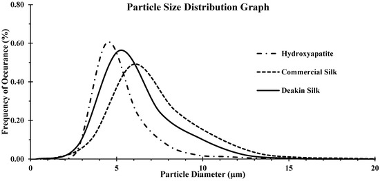 Comparison of particle size distribution of hydroxyapatite, commercial silk powder, and Deakin silk powder.