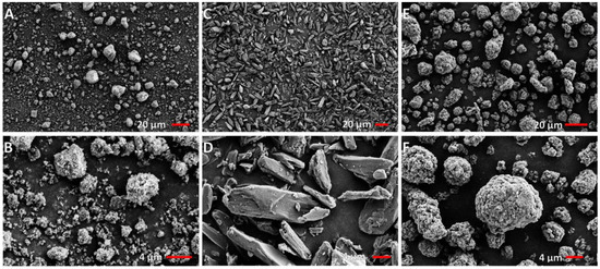 SEM images of particles: (A,B) Hydroxyapatite; (C,D) Commercial silk powder; and (E,F) Deakin silk powder.