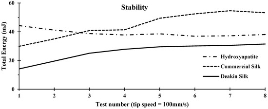 Stability comparison of hydroxyapatite, commercial silk powder, and Deakin silk powder. Stability graph comprises of the measured Total Energy (mJ) over test number.