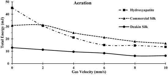 The commercial silk had a change in Total Energy of 14.64 mJ (Table 3). The change in aeration energy of commercial silk powder was significantly higher than the Deakin silk powder. This was likely due to the irregular shape and larger surface energy, and cohesion of the commercial silk powder. Deakin silk was the least affected powder by introducing gas flow with a change in Total Energy of 6.52 mJ. These particles were more spherical and, hence, are likely to be more aerodynamic. Therefore, the gas would produce less upward force onto each particle, reducing the effects of gas flow and, thus, maintaining a lower change in Total Energy.