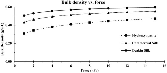 Comparison of bulk density vs. compression force for hydroxyapatite, commercial silk powder, and Deakin silk powder.