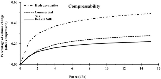 Hydroxyapatite was the most compressible of the three powders; the volume of this powder was reduced by almost half at 15 kPa (Figure 8). Hydroxyapatite had a narrower particle size distribution than silk particles, meaning there was less scope for smaller particles to fall between larger particles resulting in higher compression. In addition, since hydroxyapatite is brittle, some amount of attrition was likely during the test, further increasing the compressibility compared to the two silk powders.