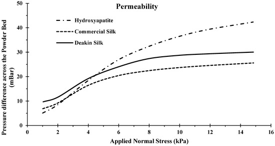 Commercial silk and Deakin silk produced very similar results, with an average variance of pressure difference across the compression levels of around 3 kPa. From the compressibility experiment, we observed that the Deakin silk had a higher overall bulk density than the commercial silk, which would lead to a lower permeability (Figure 9). However, from the compressibility experiment, we also observed that hydroxyapatite had a lower bulk density and experienced lower permeability. This would be due to the attrition, as generally smaller particles exhibit lower permeability. Hydroxyapatite was recorded to have the smallest particles (Figure 9). When the powder experienced attrition, the particles became even smaller, filling space where it was possible for gas flow to occur, increasing permeability substantially.
