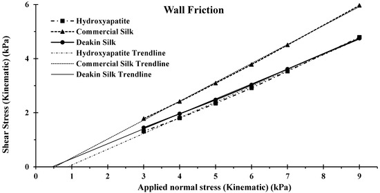 Wall friction of hydroxyapatite, commercial silk powder, and Deakin silk powder.